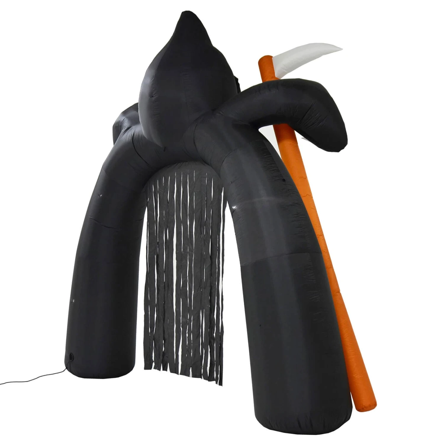 The extra large light up inflatable Halloween decoration is designed like a gateway. Guarded by the Grim Reaper with skull face, orange handle scythe and skeleton hands, it has a black stranded curtain for your doorway. This creepy Halloween inflatable is lit by 5 white LED lights and is 3.65m (12′) high. Suitable for indoor and outdoor use.