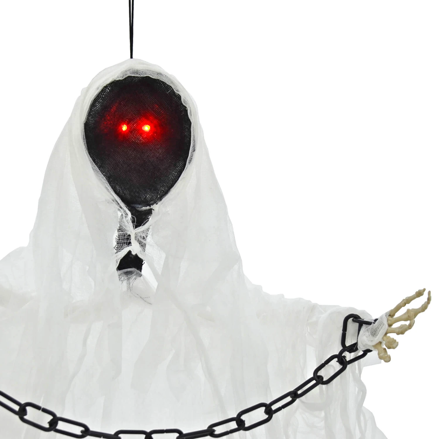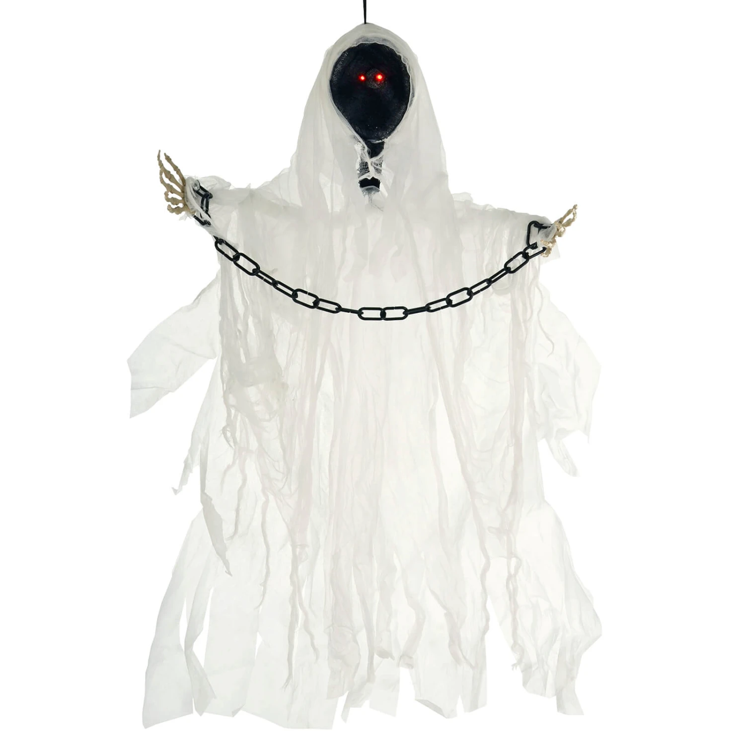 The Hanging Skeleton Halloween decoration has flashing red LED eyes in a faceless head. The ghostly skeleton has a black chain attached to the wrists and white tattered clothing. At 92cm (3′) tall it’s perfect for Halloween parties.