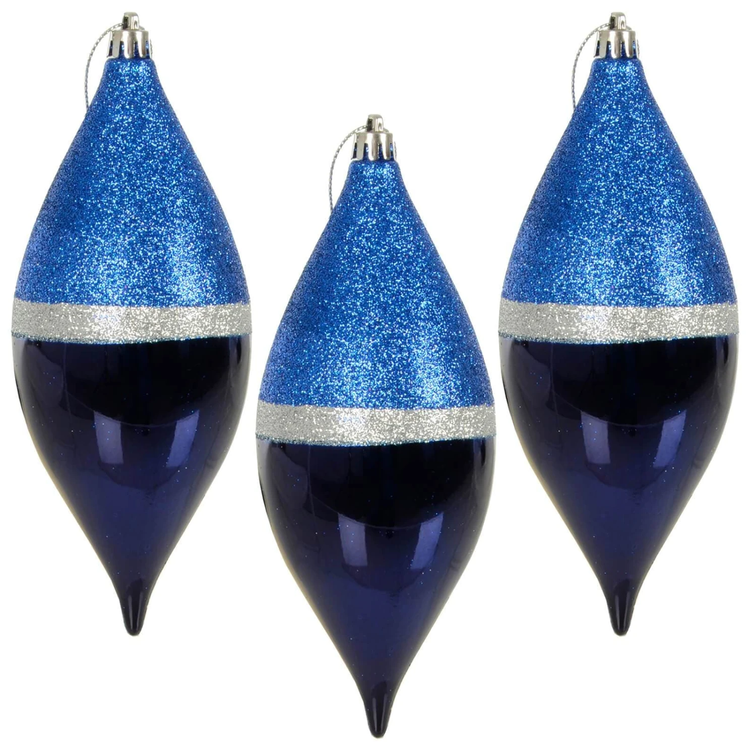 This pack contains 3 blue, navy and silver teardrop shape Christmas tree baubles with glitter and gloss finish. The baubles are 18cm long and come with silver cap and hanging loop. Perfect for your silver and blue themed Christmas decor.