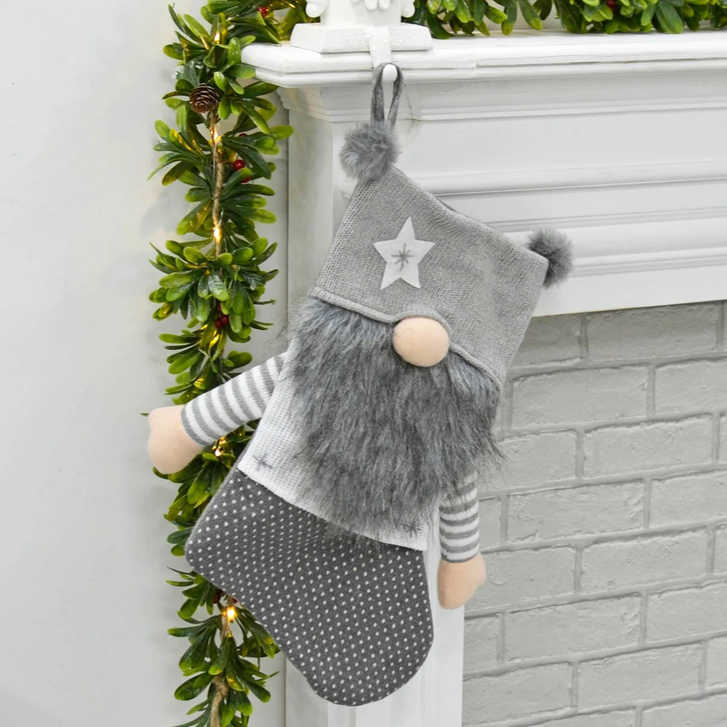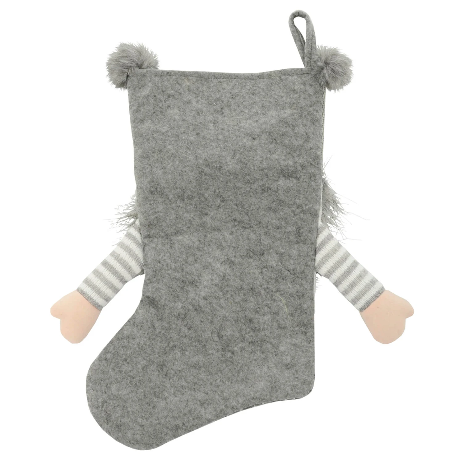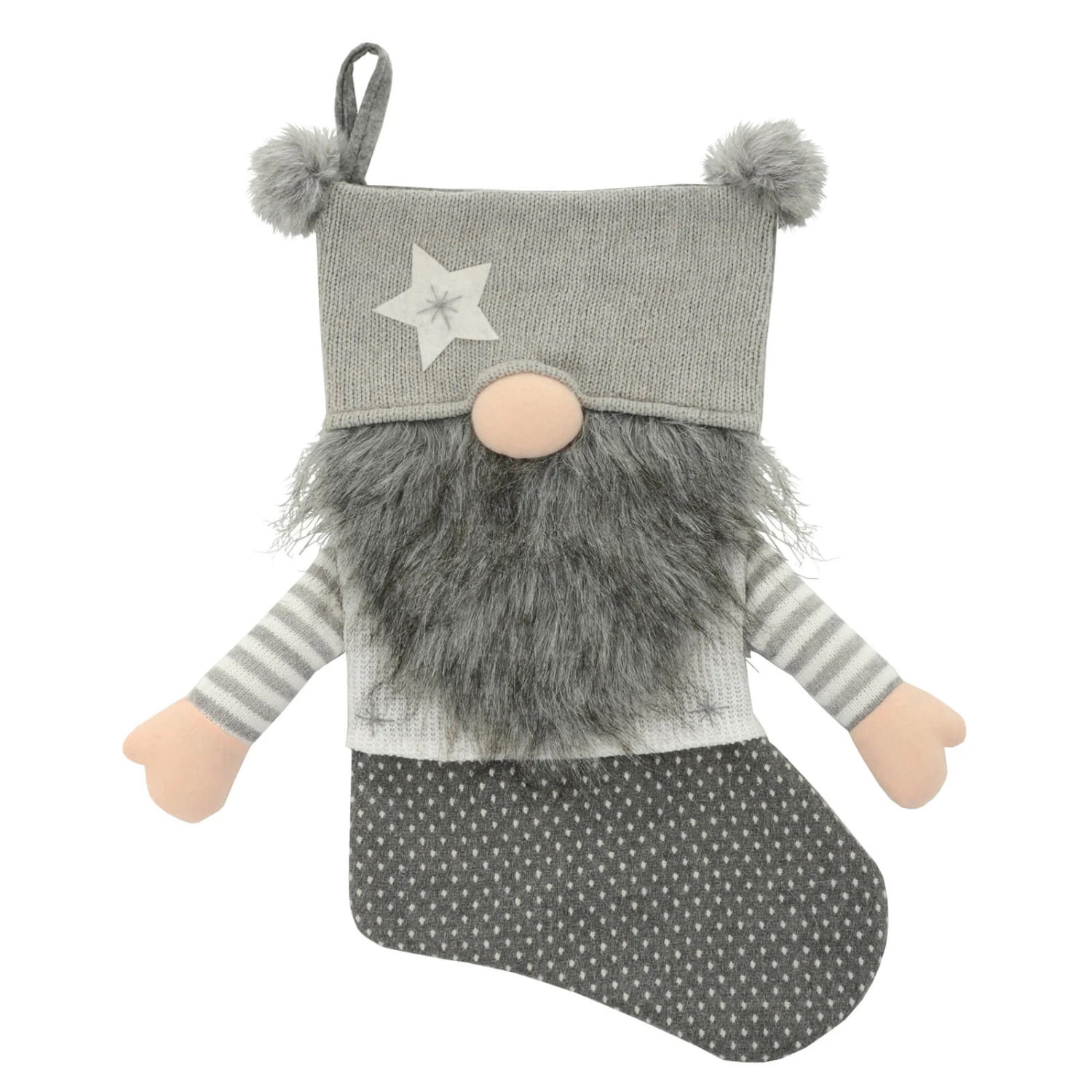 The gonk style Christmas stocking is made from soft knit, felt and fleece fabrics. With long white beard, cute pink nose, striped arms and pom poms, it’s a great decoration for your festive fireplace. Choose from red or grey to match your Christmas theme.