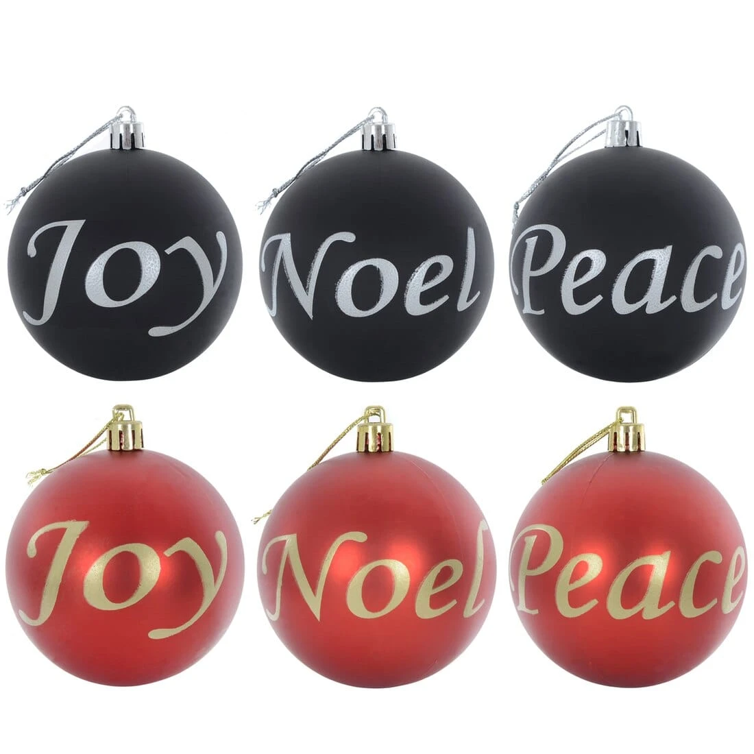 Add a traditional touch to your Christmas decor this year with these Joy, Peace and Noel baubles from Mr Crimbo! Each set comes with six decorative baubles, 2 x joy, 2 x peace and 2 x noel. The black baubles have silver writing with silver caps and hanging thread, and the red baubles have gold writing with gold caps and hanging thread.