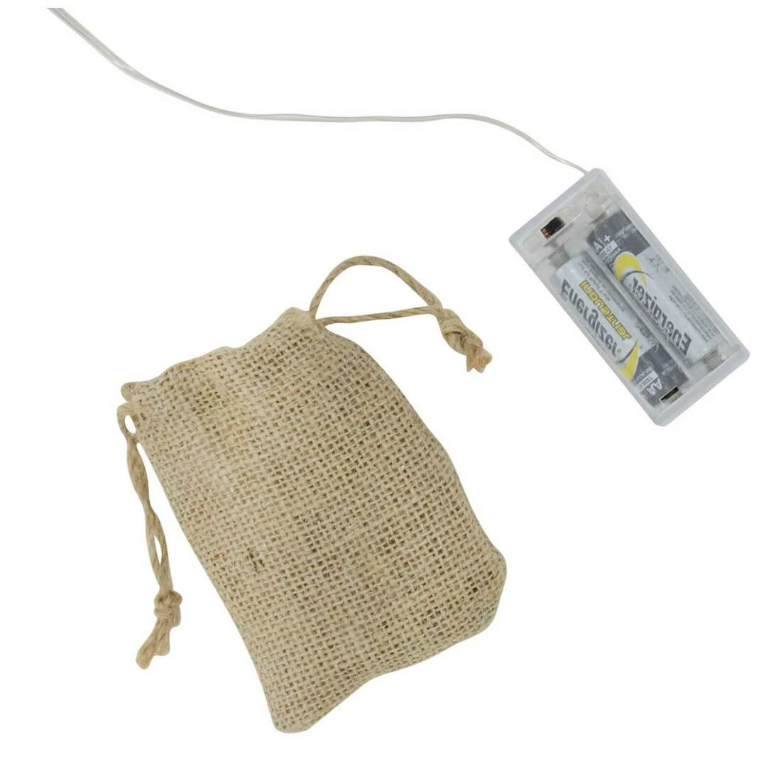 To finish, the wreath has been wrapped with string lights that emit a warm white light when switched on. The lights can be controlled by the attached battery pack that has been concealed by a small jute bag.