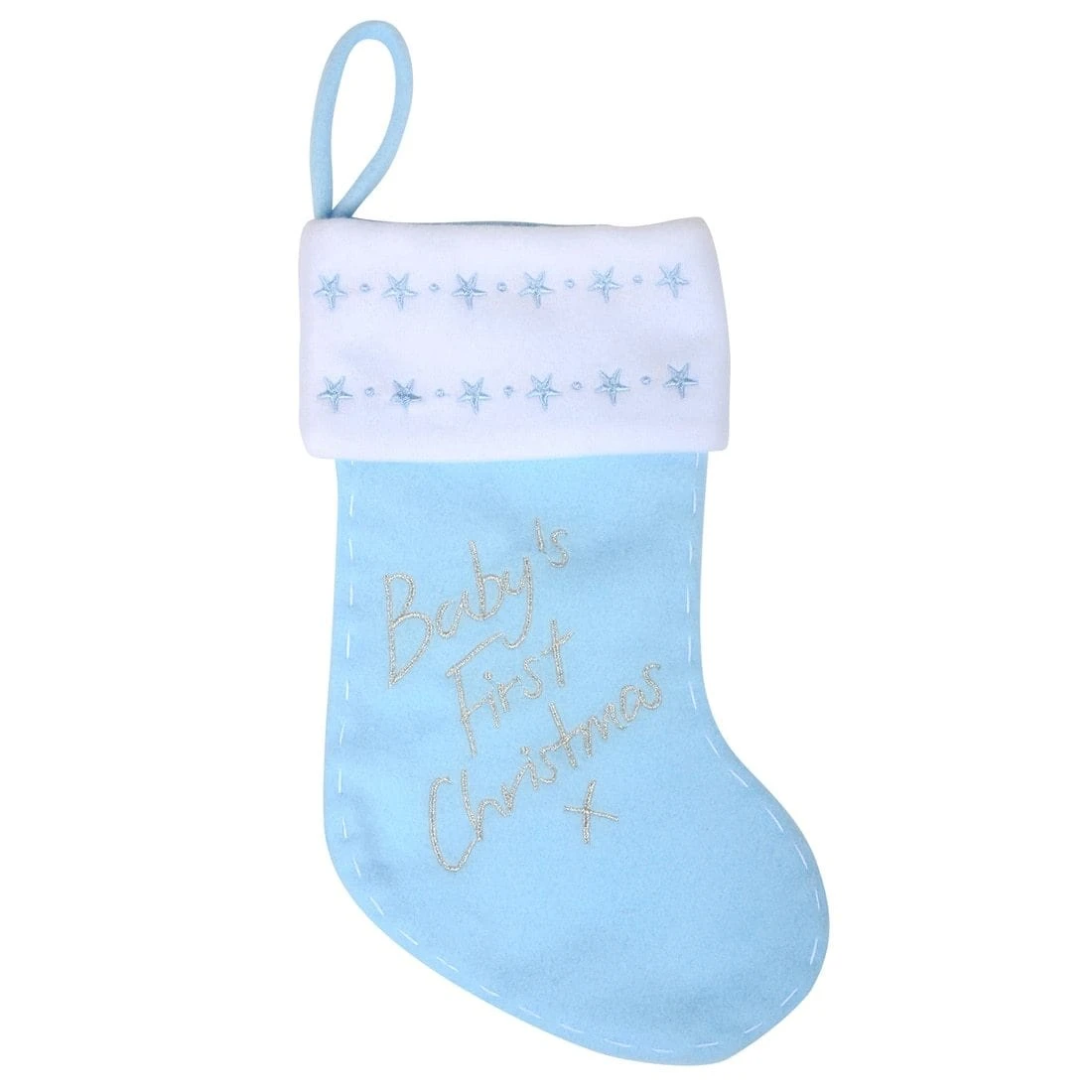 Celebrate baby’s first Christmas with this festive stocking. Made from soft blue fleece fabric, it features silver embroidered “Baby’s 1st Christmas” text on the front and blue stars on the white cuff.
