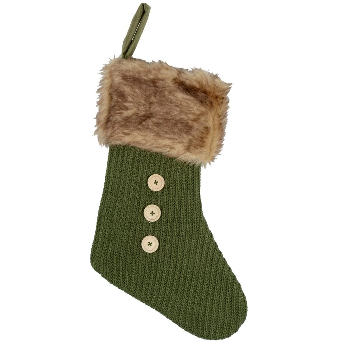 This green, felt stocking features a ribbed, knitted front with three wooded buttons and a soft, faux fur, folded down trim at the top. Complete with hanging loop for easy attachment to walls, fireplaces etc. and with plenty space for little Christmas gifts!