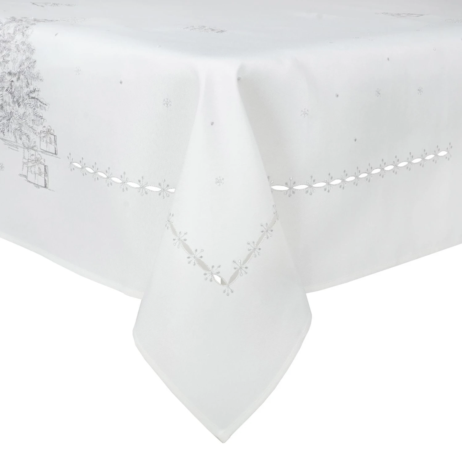 The white tablecloths feature embroidered Christmas trees, presents and other Christmassy details. The design is available in black and white or in red and green.