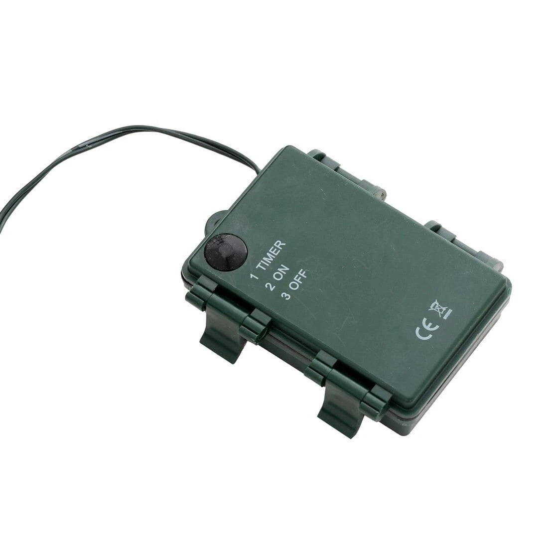 The lights on this wreath can be set on a timer. Push the button on the battery pack once to switch the lights on for 8 hours. After 8 hours have passed, they’ll automatically switch off for 18 hours. And then automatically switch on again for another 8 hours and so on.