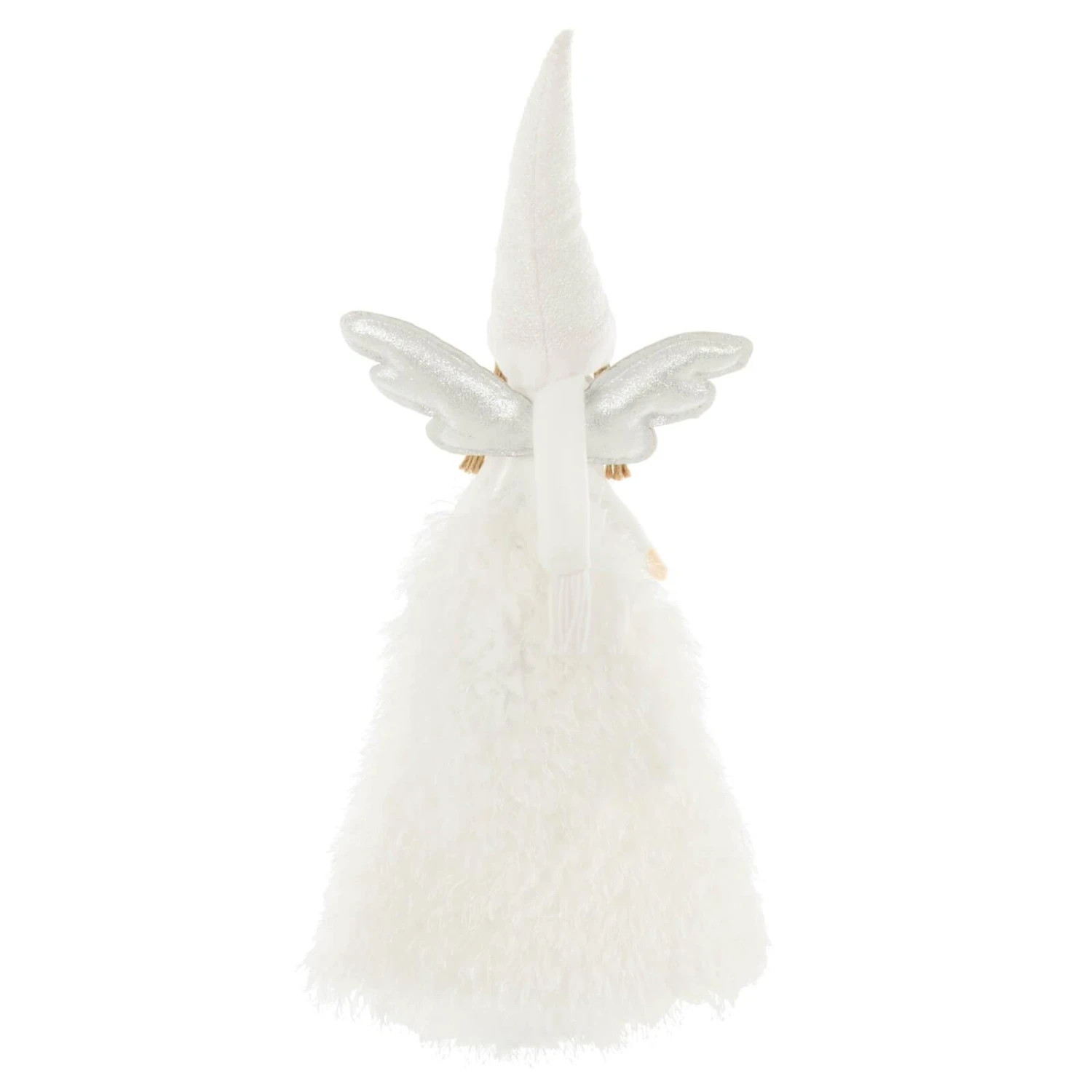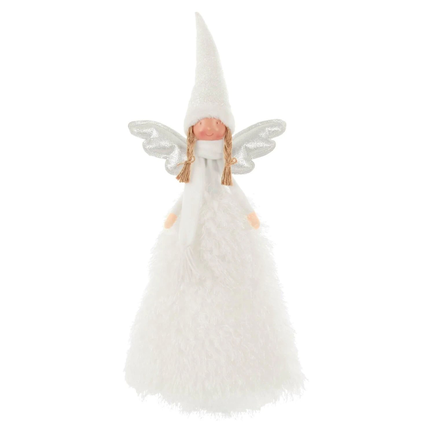 This stunning Christmas fairy tree topper has a long shimmering gown, white fleece scarf, sparkling tall pointed hat and glittering silver wings. Her hessian hair is tied in plaits and her arms have wire for styling.