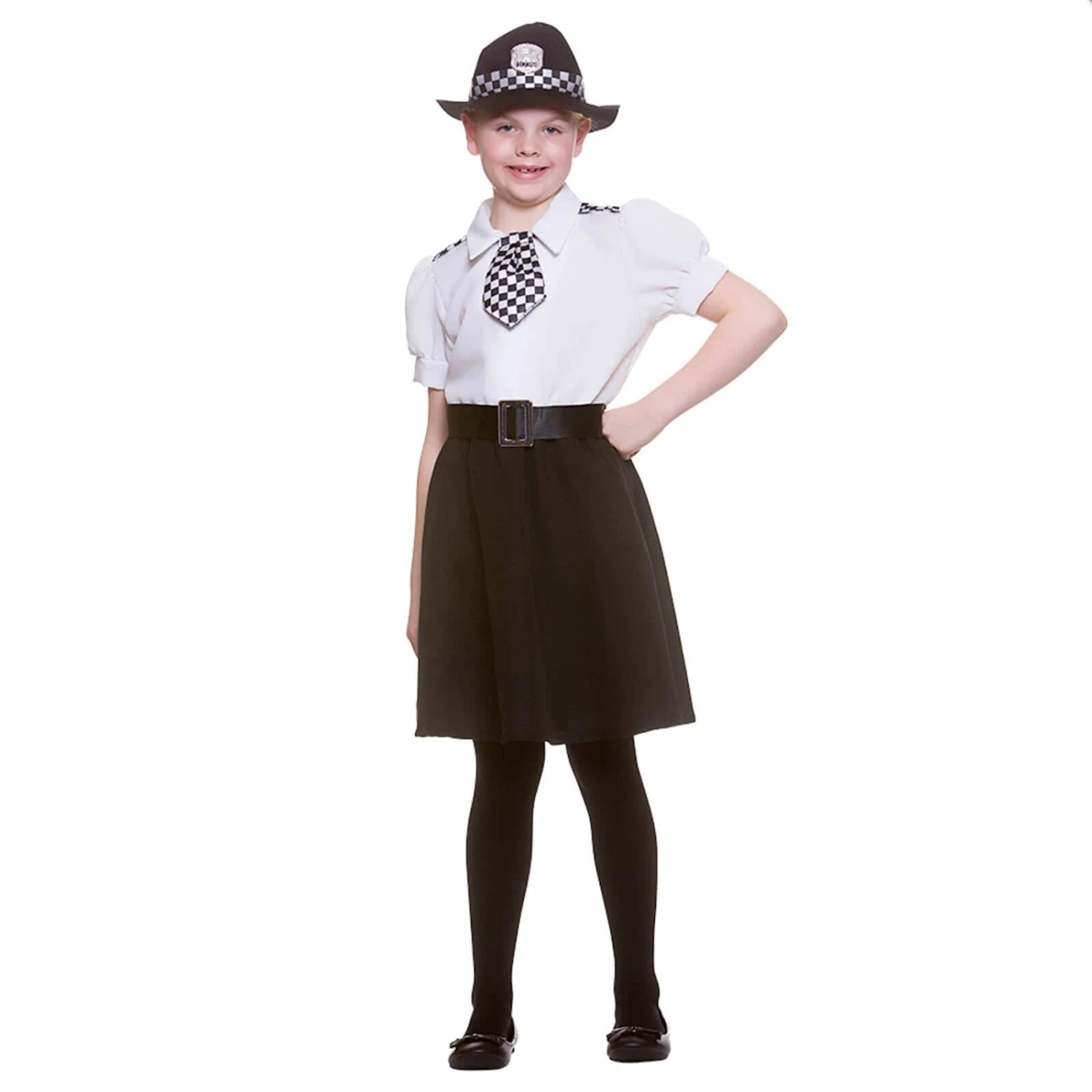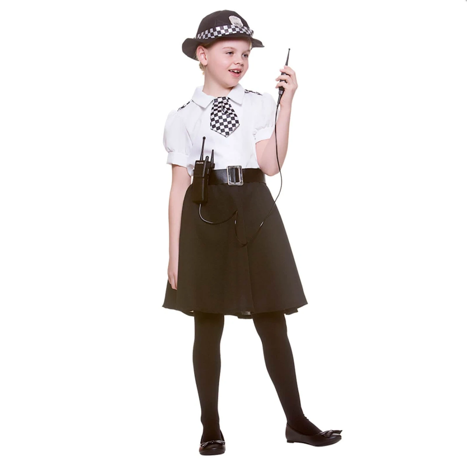 The WPC outfit includes a white blouse, black skirt, black belt, checkered tie and a police hat with badge. Perfect for Halloween fancy dress parties, uniform theme events, theatre and drama groups, pretend and role play fun.