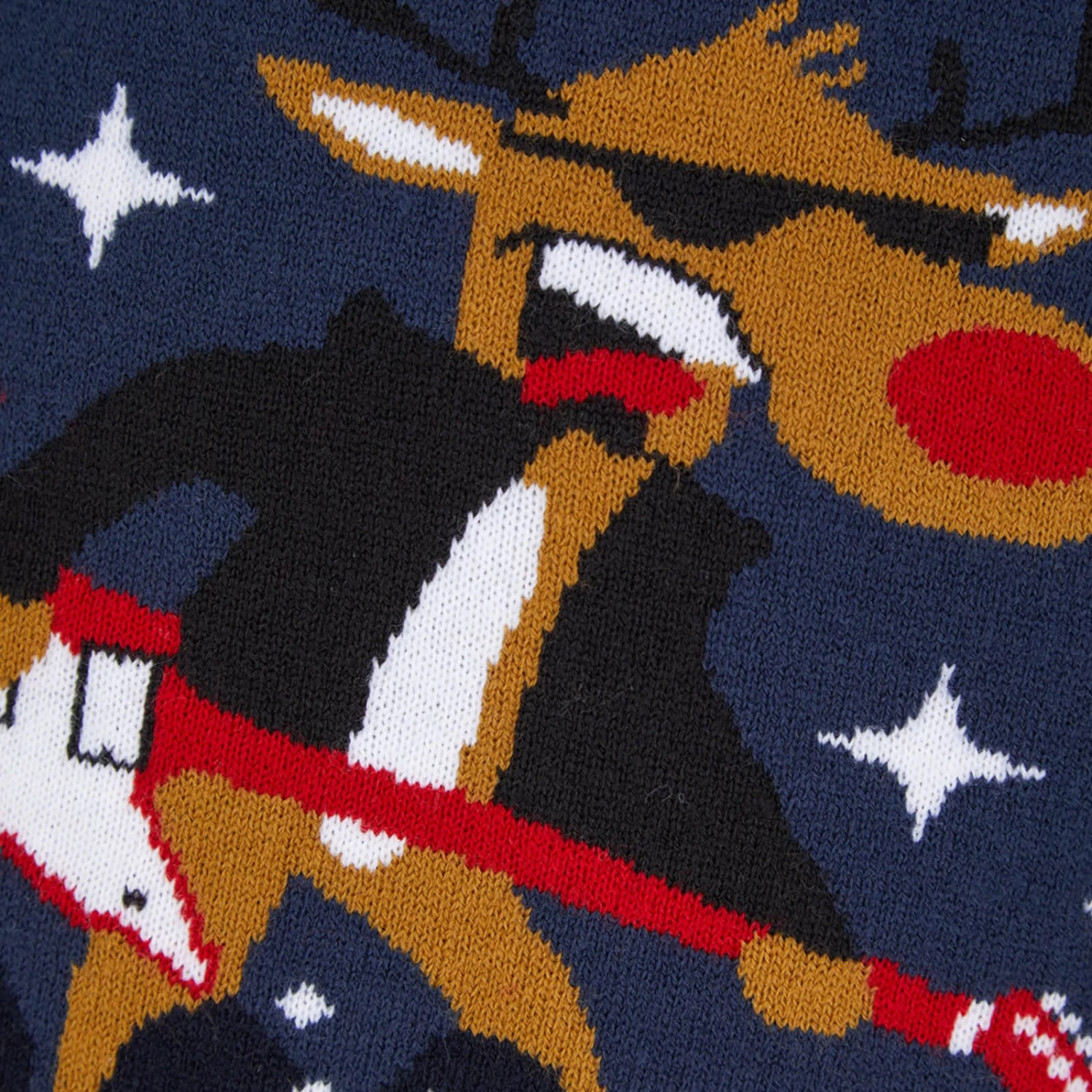 Your little one will love wearing this Christmas jumper over the festive season. The Xmas sweater features a reindeer wearing shades holding an electric guitar with the slogan Rebel without a Claus around it. The soft knit, crew neck Christmas jumper for kids is available in Red or Blue and in child sizes from age 4 to 12. Perfect for family seasonal celebrations, Christmas Jumper Day and a great gift idea!