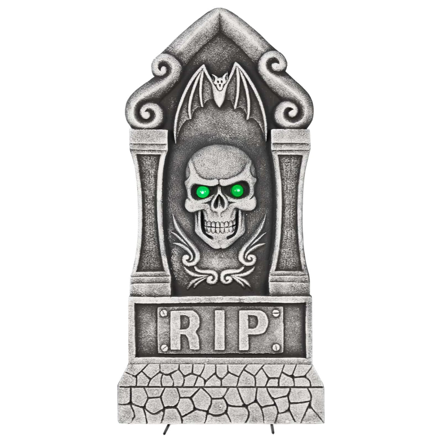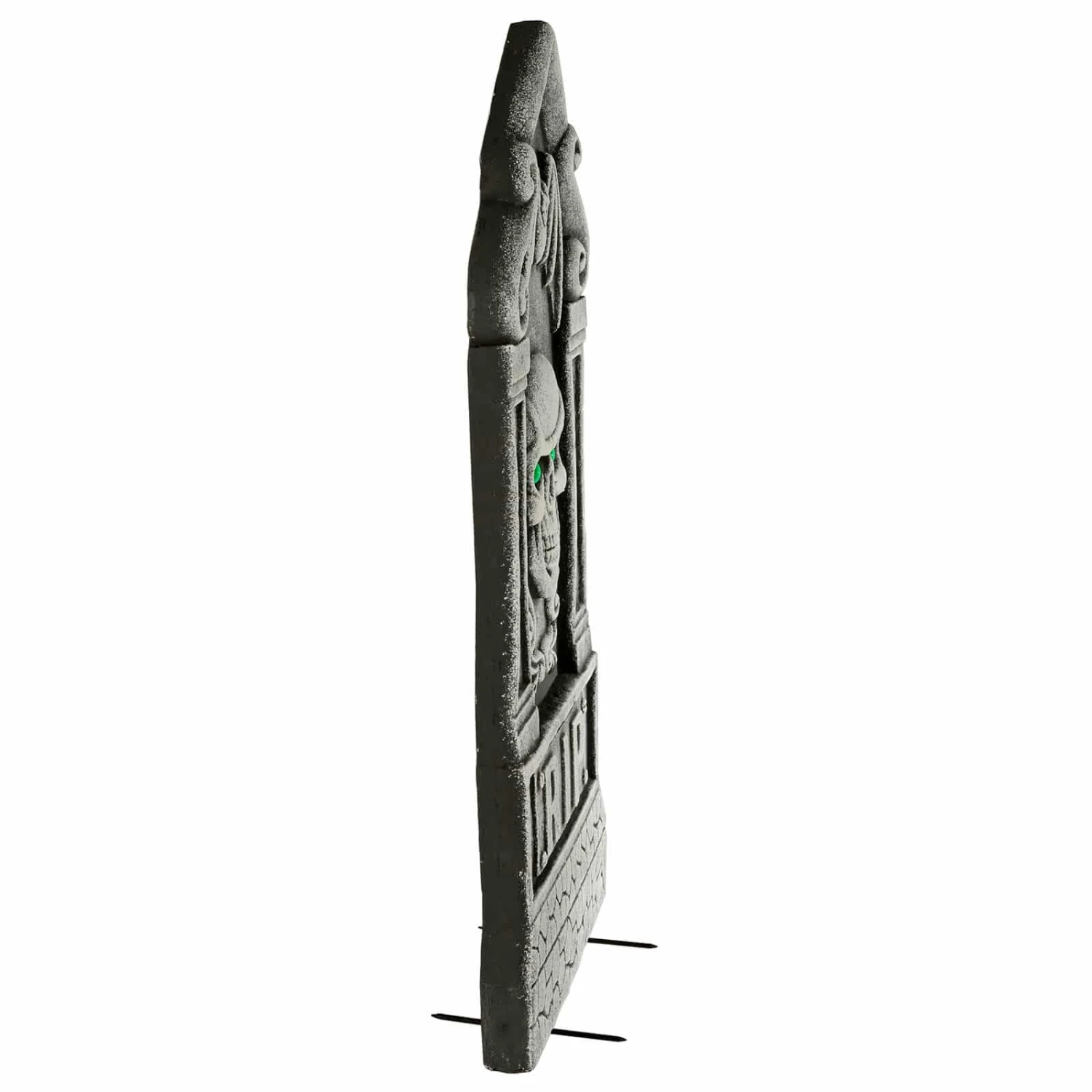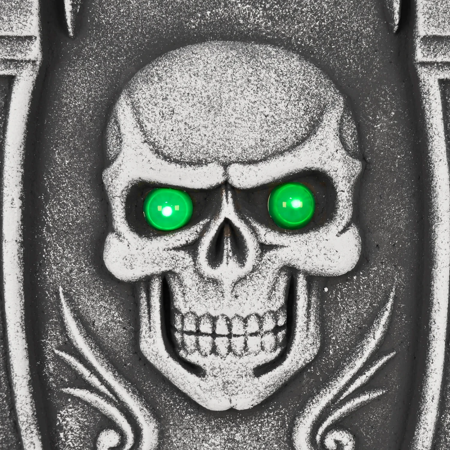The 90cm (36″) tall headstone Halloween decoration features a skull with 2 pulsing green LED eyes. The large tombstone also features a bat and ornate detailed stonework. Made from water resistant polyfoam it’s suitable for indoor and outdoor use.