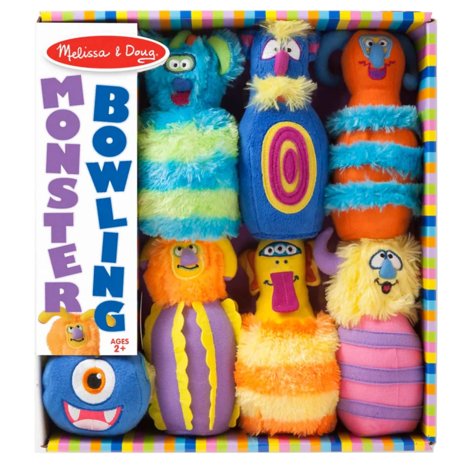 • 8 piece fuzzy wacky monster-themed bowling set