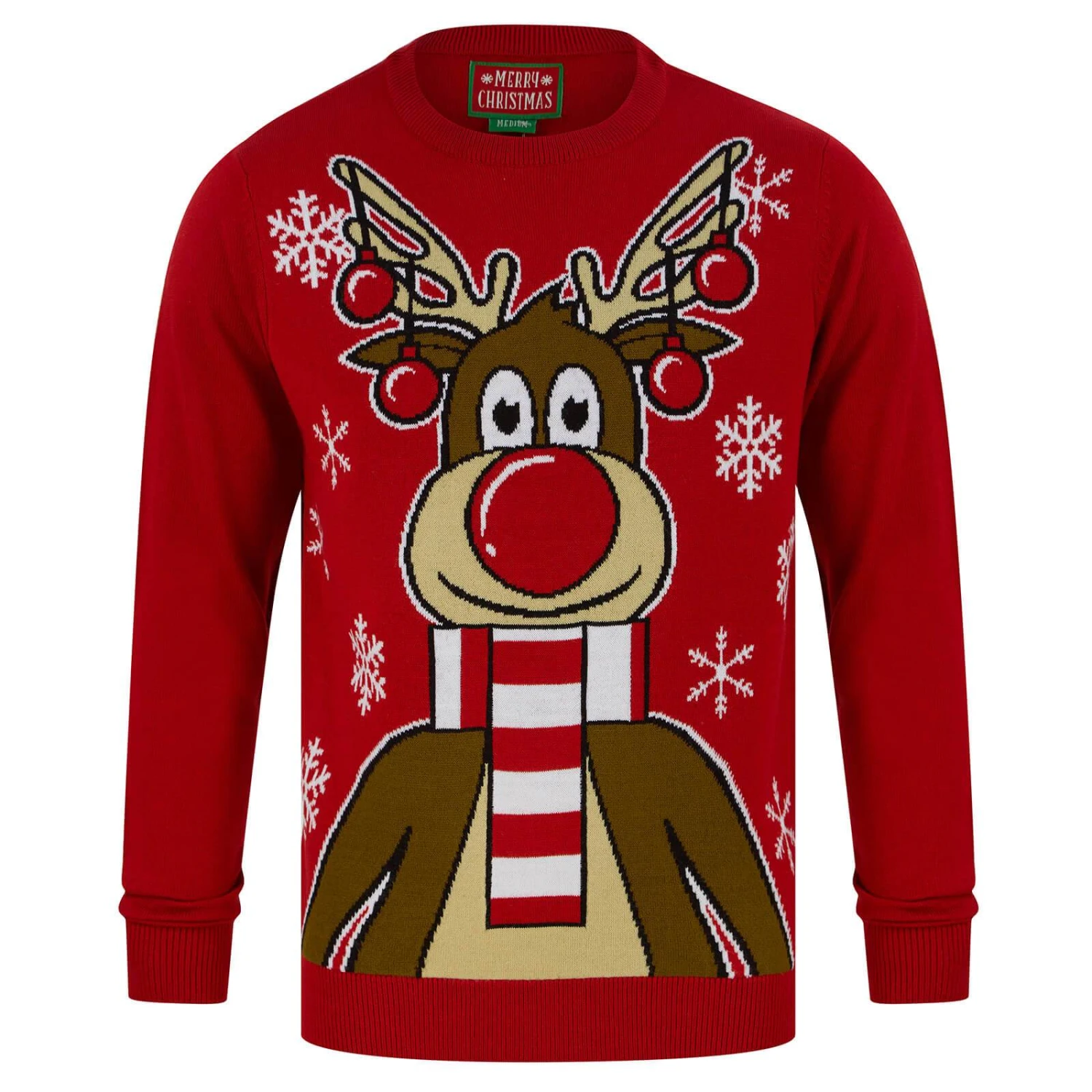 Why not take him with you wherever you go with this fabulous novelty mens xmas jumper. It features Rudolph getting into the festive spirit with a red and white stripe scarf and some baubles hanging in his antlers. There are even some snowflakes to finish off that Christmas look.