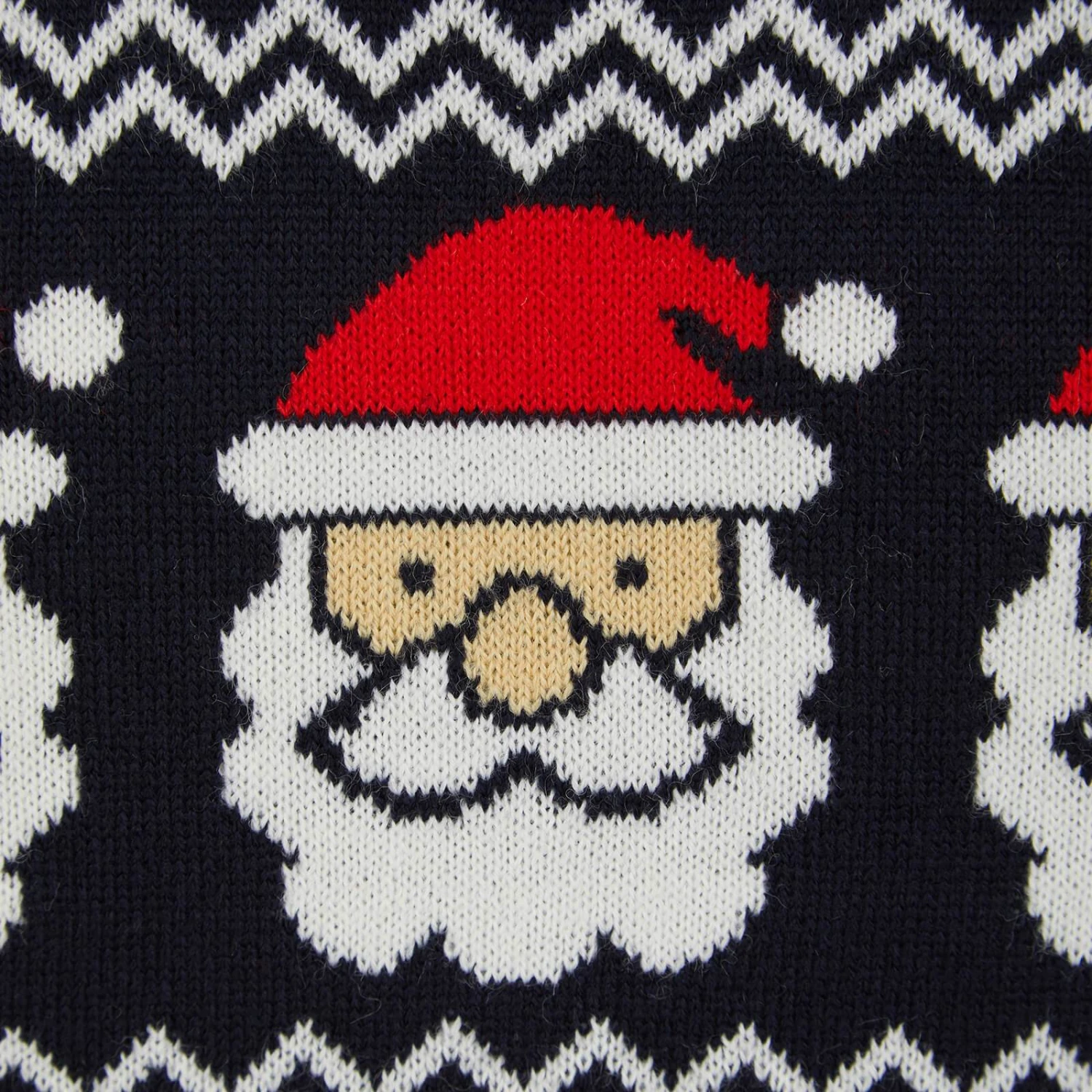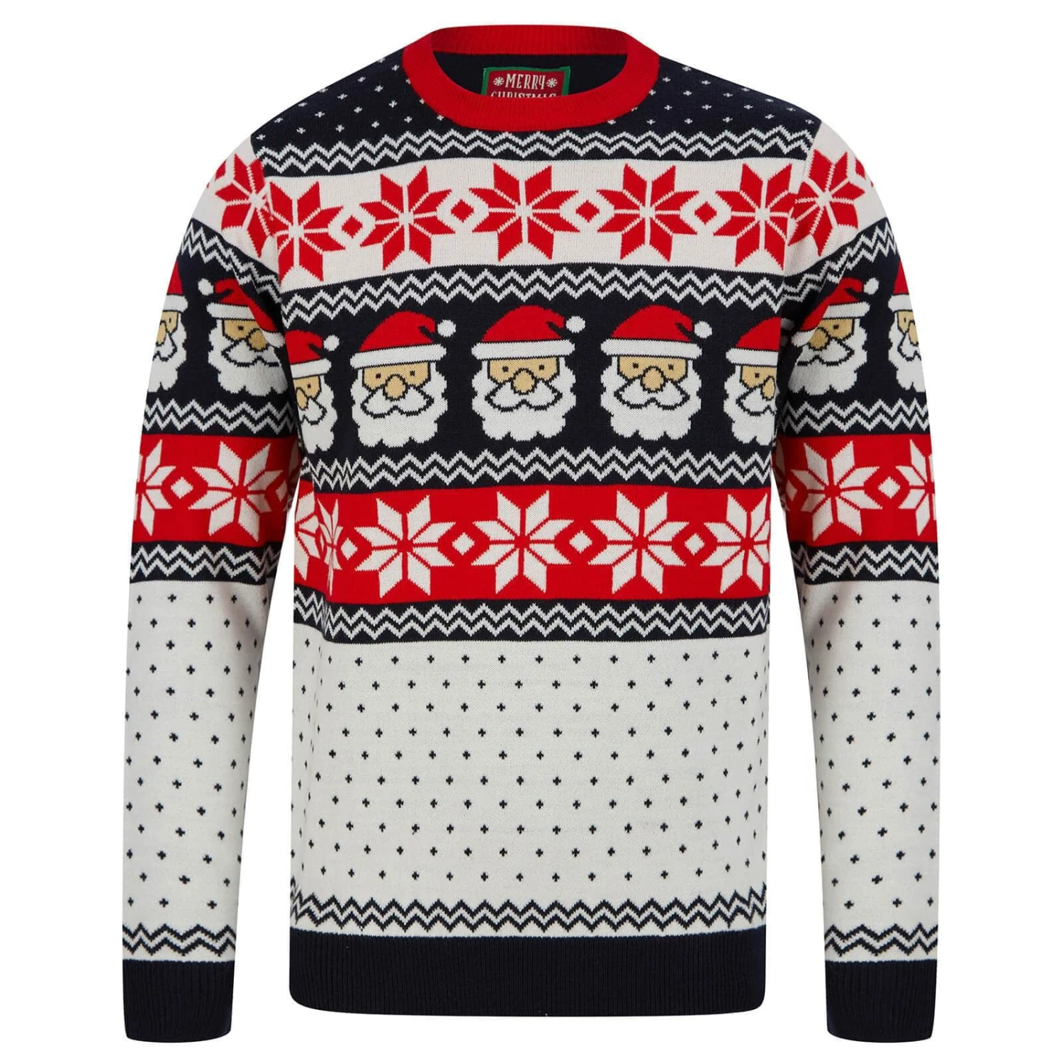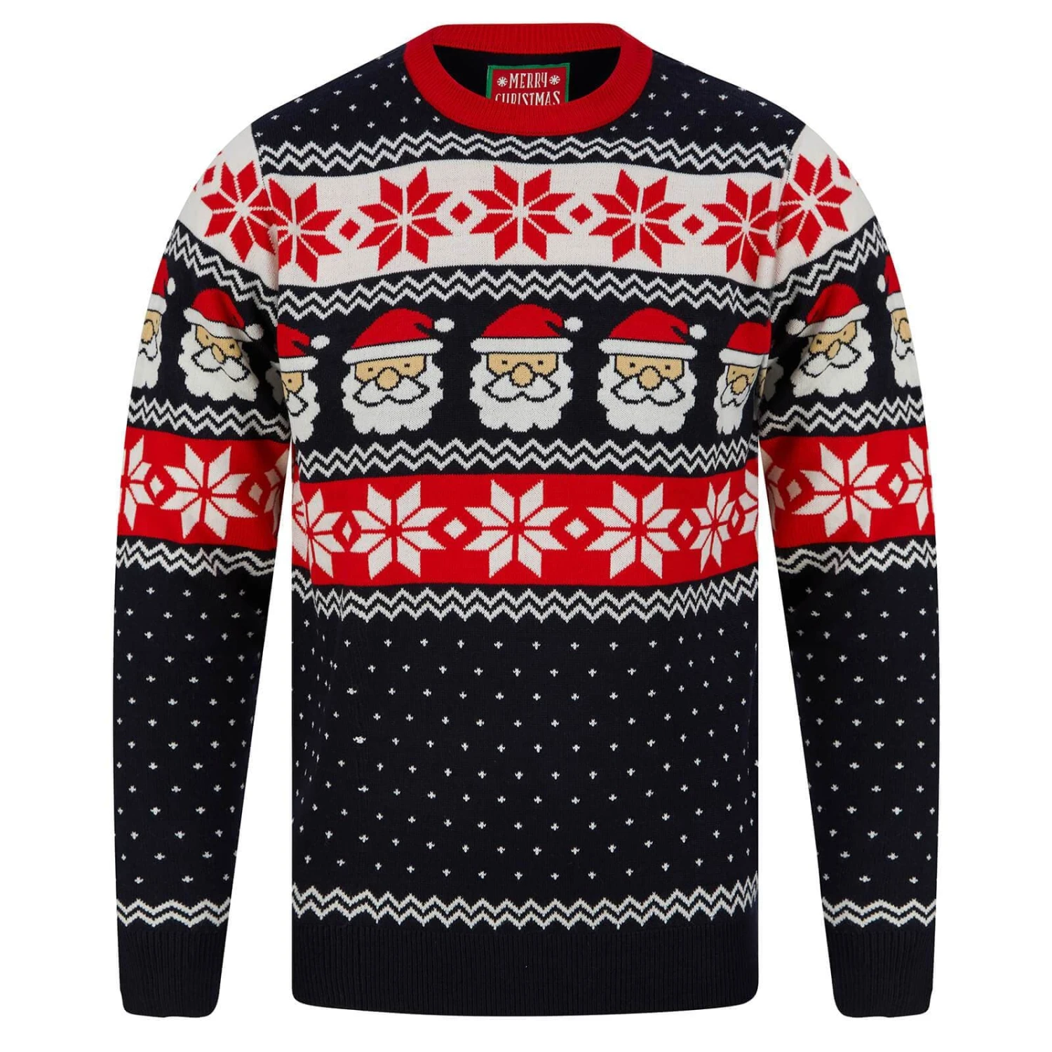 It is a more traditional style jumper than all the novelty ones but will still get you and everyone around you in the christmas spirit. It features bands of red snowflakes on a white background, santa faces on a dark blue background and white snowflakes on a red background.