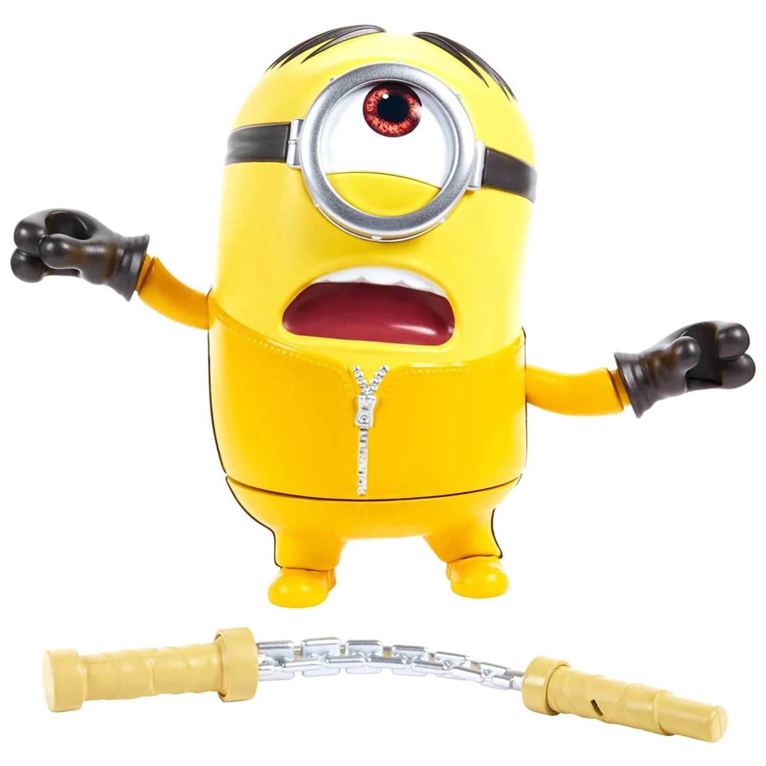 Minions fans will love playing with this Rise of Gru Mighty Minions Stuart action figure. Pull his arm and release for over 15 phrases and sounds. Watch as Stuart swings the removable nunchuck. Figure height: 18cm (7″), suitable for ages 4+