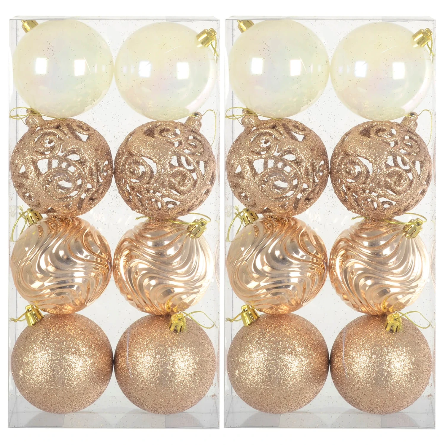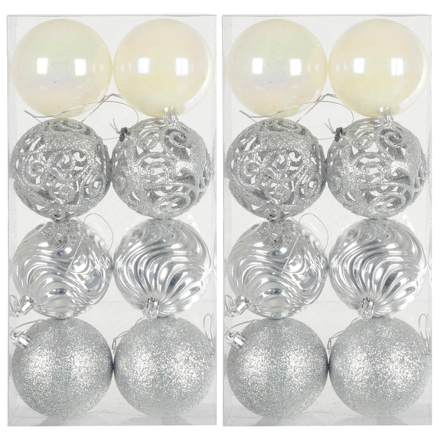 The pack contains 16 x 8cm baubles in 4 designs including pearlised white. Available in a choice of festive colours to match your Christmas decor. Each bauble comes with gold or silver string already attached for hanging. Perfect for xmas trees and garlands throughout your home.