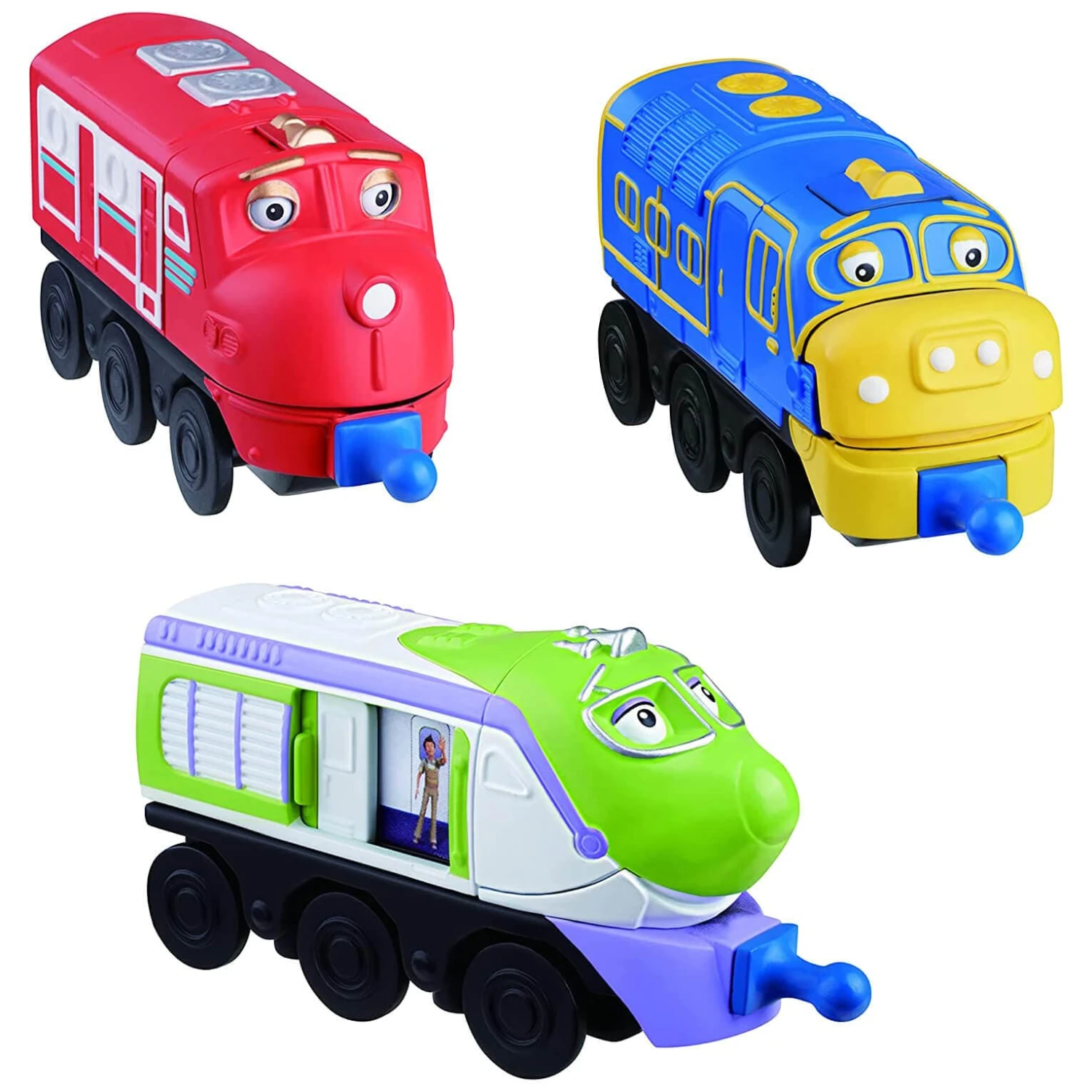 Wilson, Brewster and Koko are ready for new adventures. Each train engine comes with surprise motion feature. Move Wilson’s eyes back and forth. Open and close Brewster’s mouth. Slide open Koko’s door to reveal a friendly passenger on board.