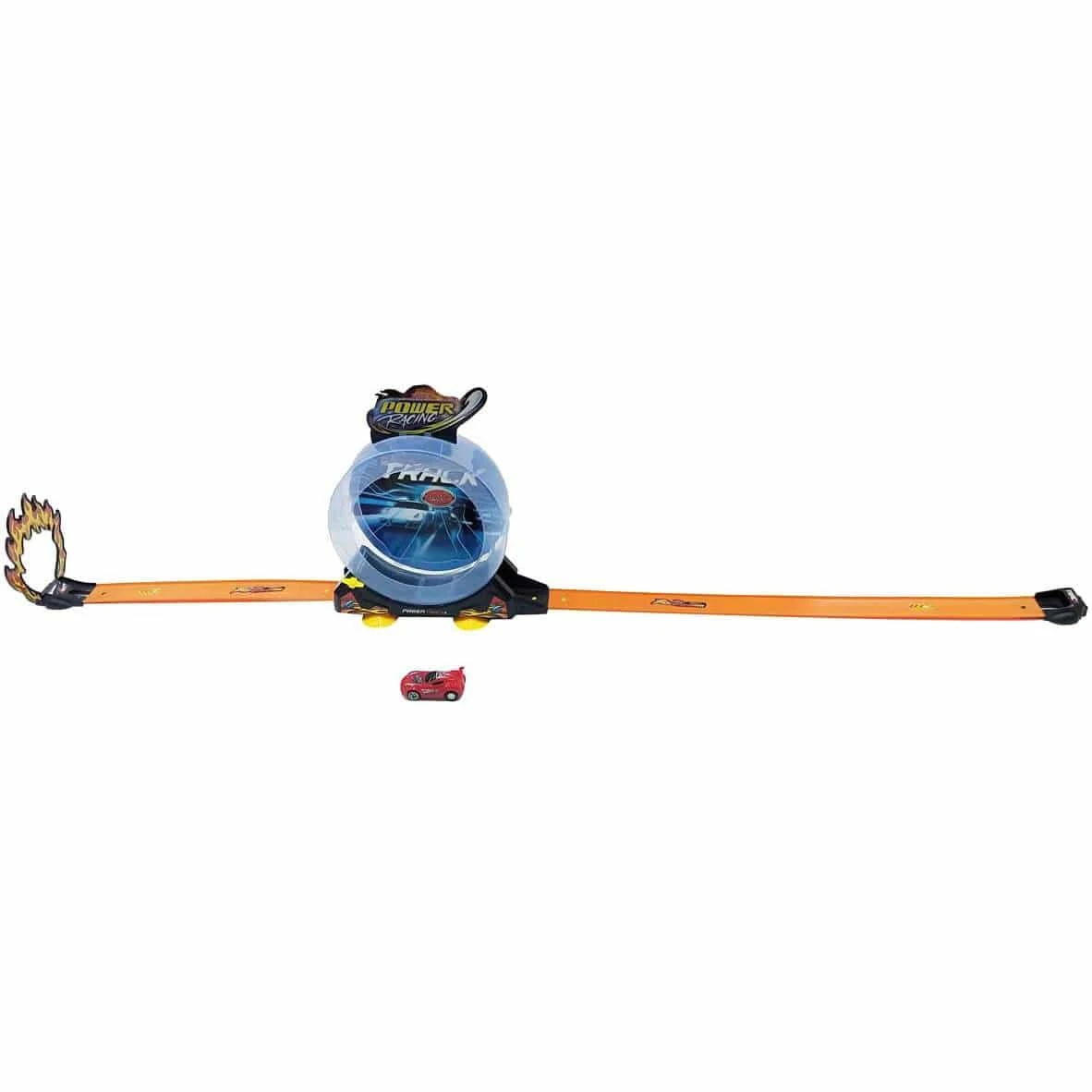 Spinforce 360 is a high speed pull back car track set with infinity loop centrepiece and one car. Wind the car up, place at the start of the track and release. The car will speed into the 360 infinity loop and will continue spinning until player manually opens escape door. Time it right and race out to victory. Time it wrong and watch the epic crash. Suitable for ages 3+