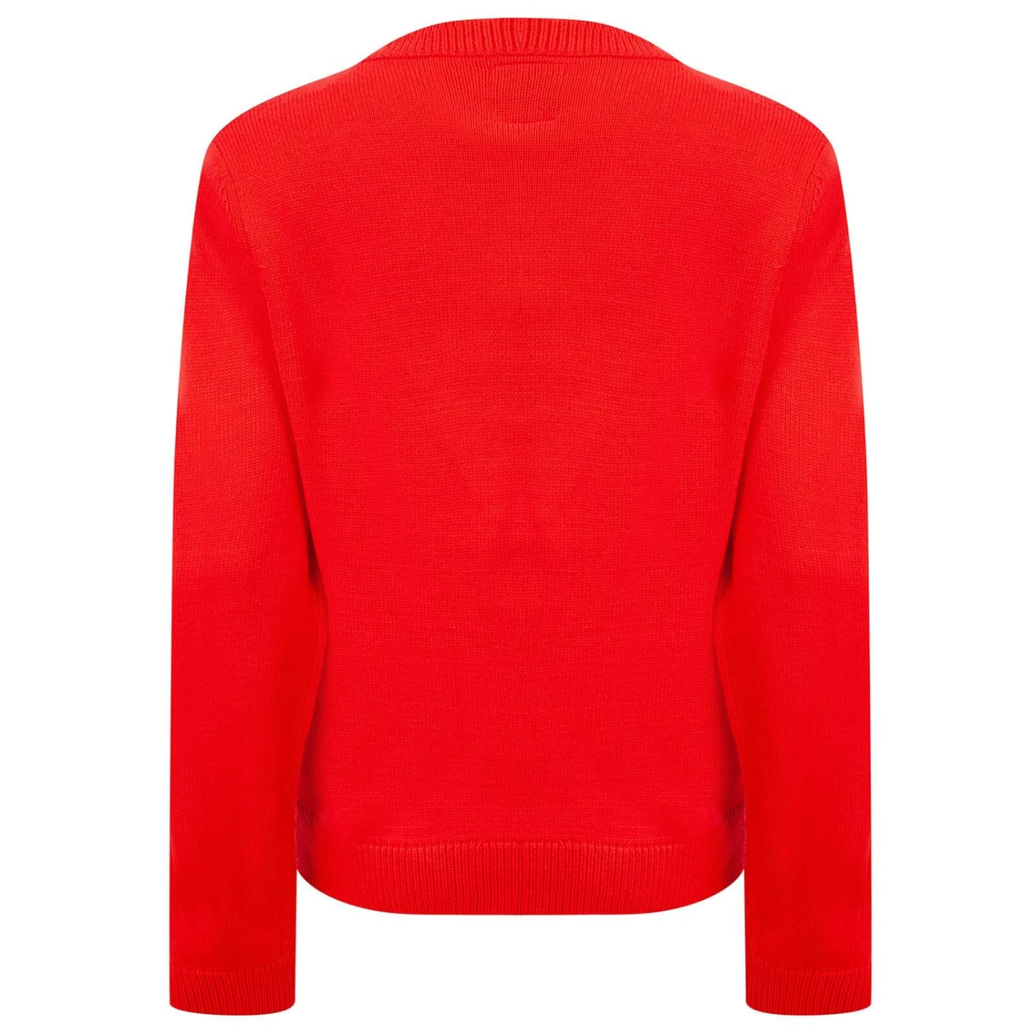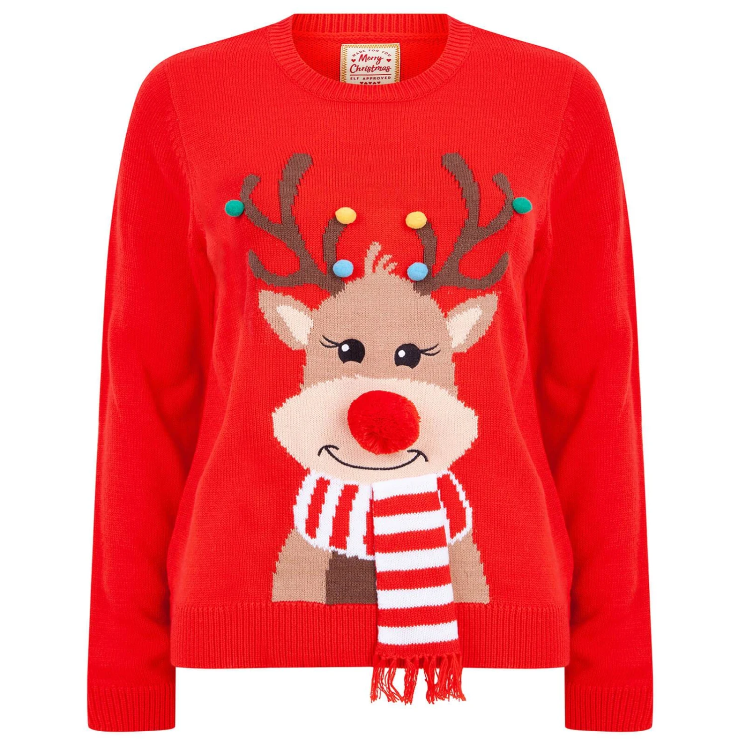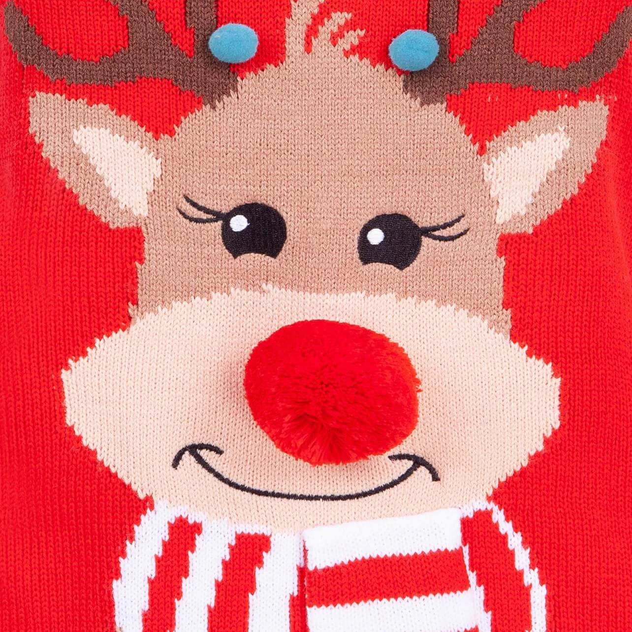 This novelty Christmas jumper for women features an adorable Rudolph the reindeer with coloured pom pom baubles on his antlers, a big red pom pom nose and a 3D red and white striped scarf with tassels. All on a festive red background.