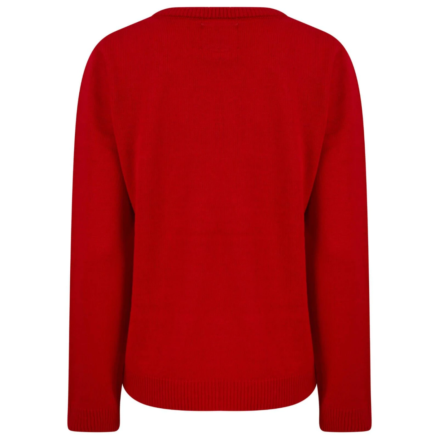 This fabulous ladies Christmas jumper features a very cute happy prancing reindeer complete with a red nose, gold sequin antlers and a faux fur face and body.