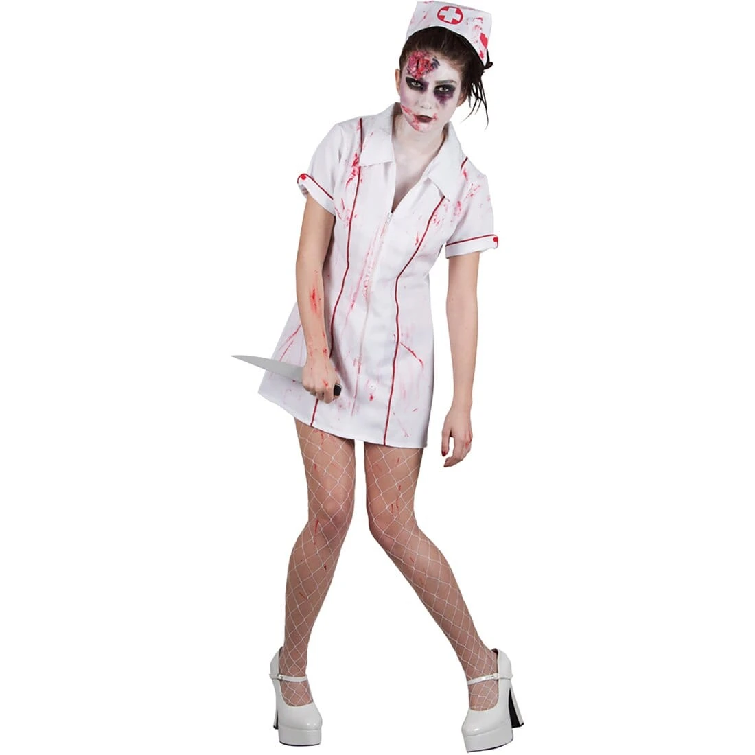 This costume includes a white nursing dress with spattered blood & white nursing headpiece with a splatter pattern.